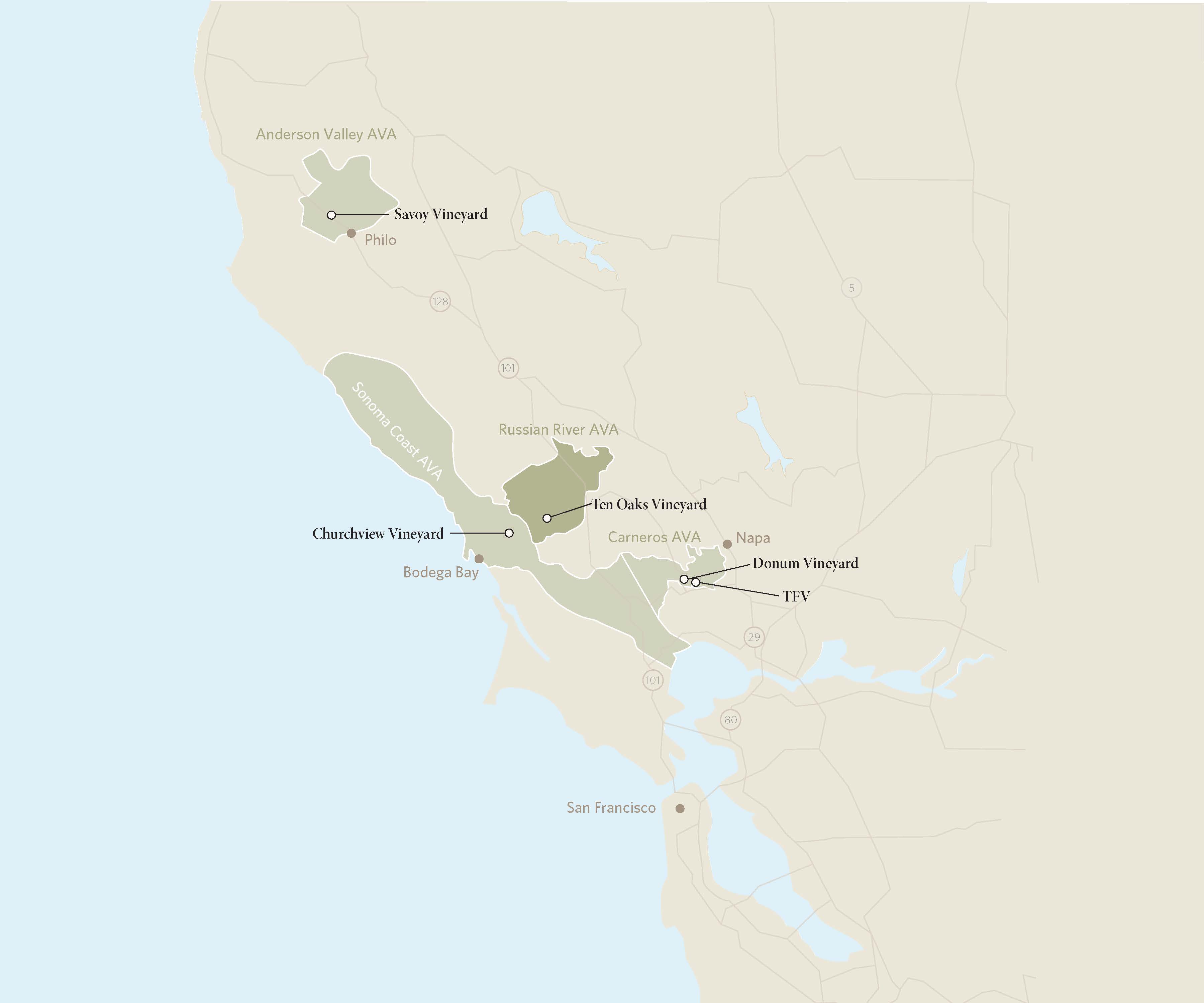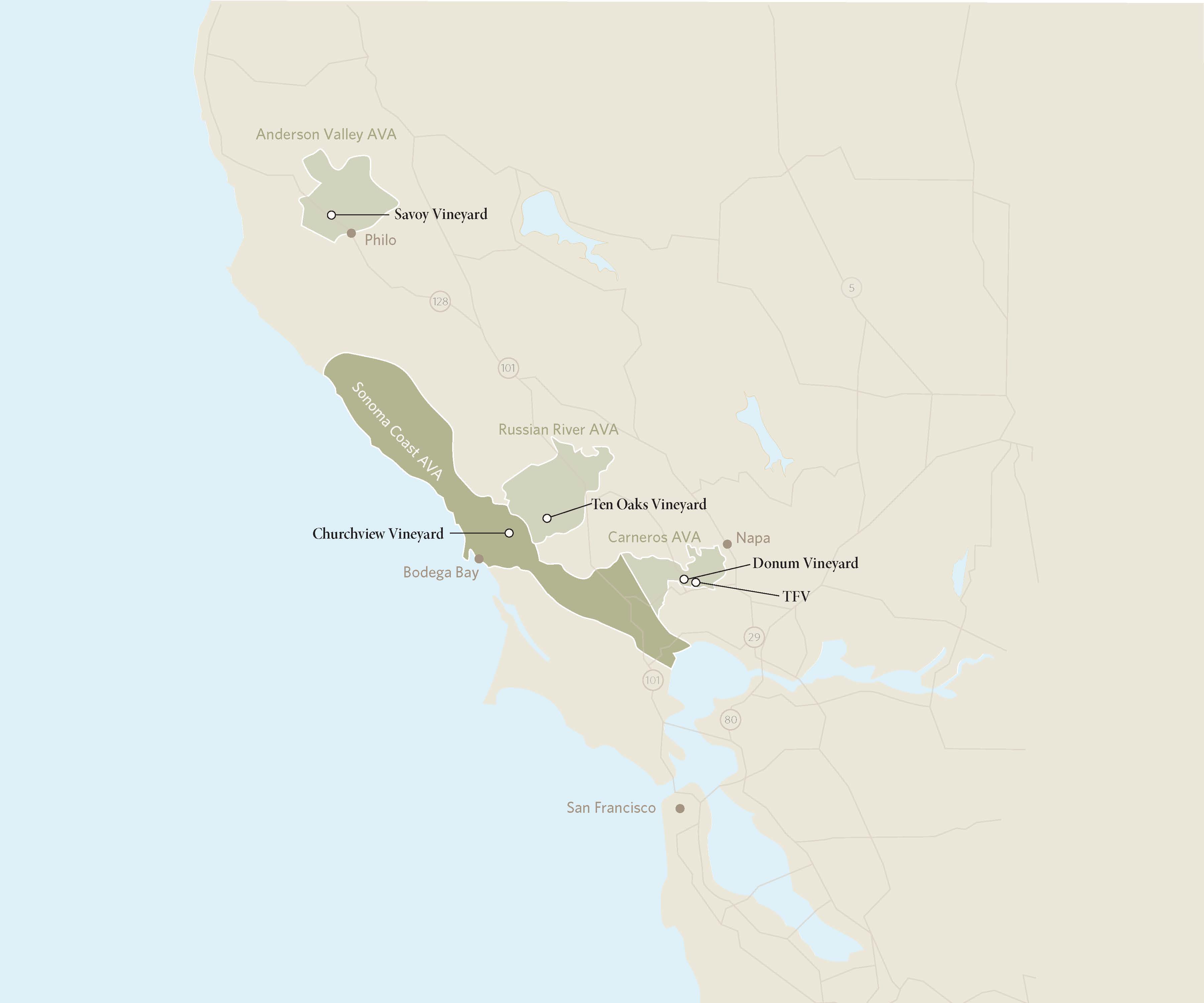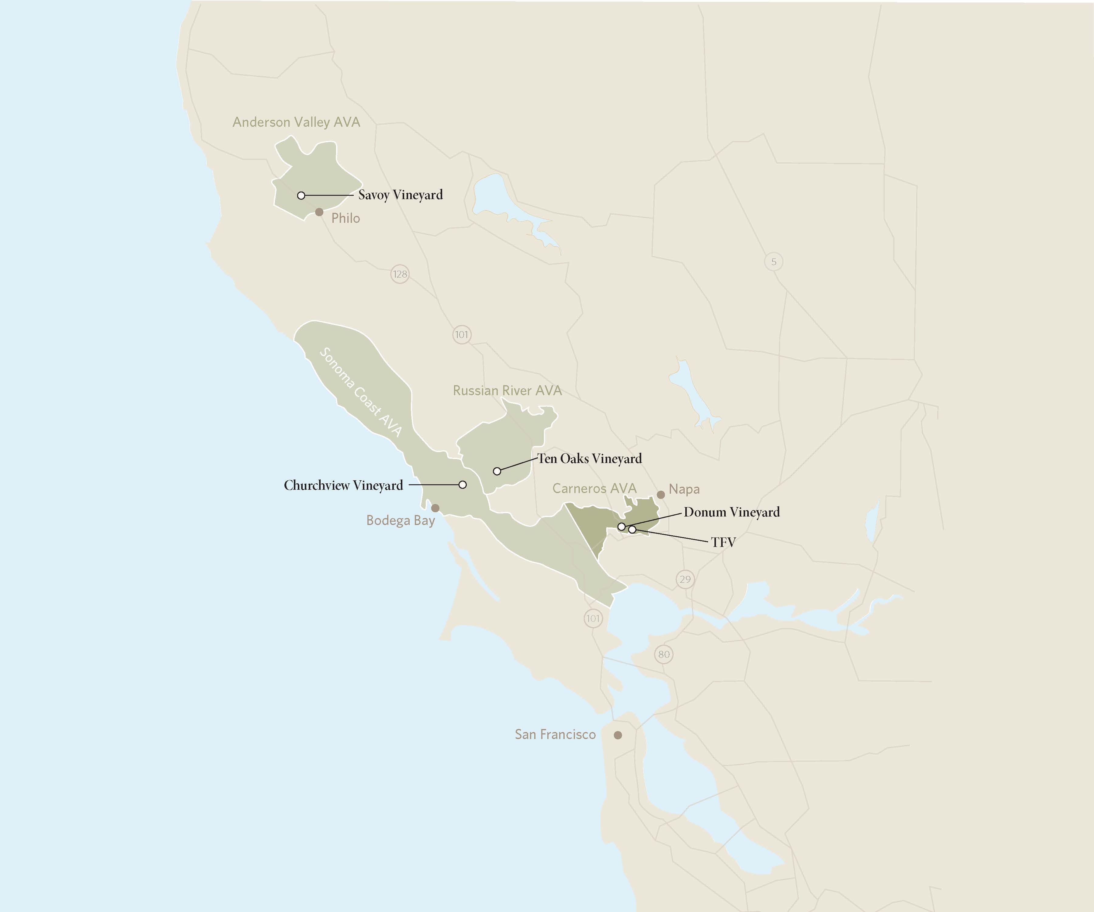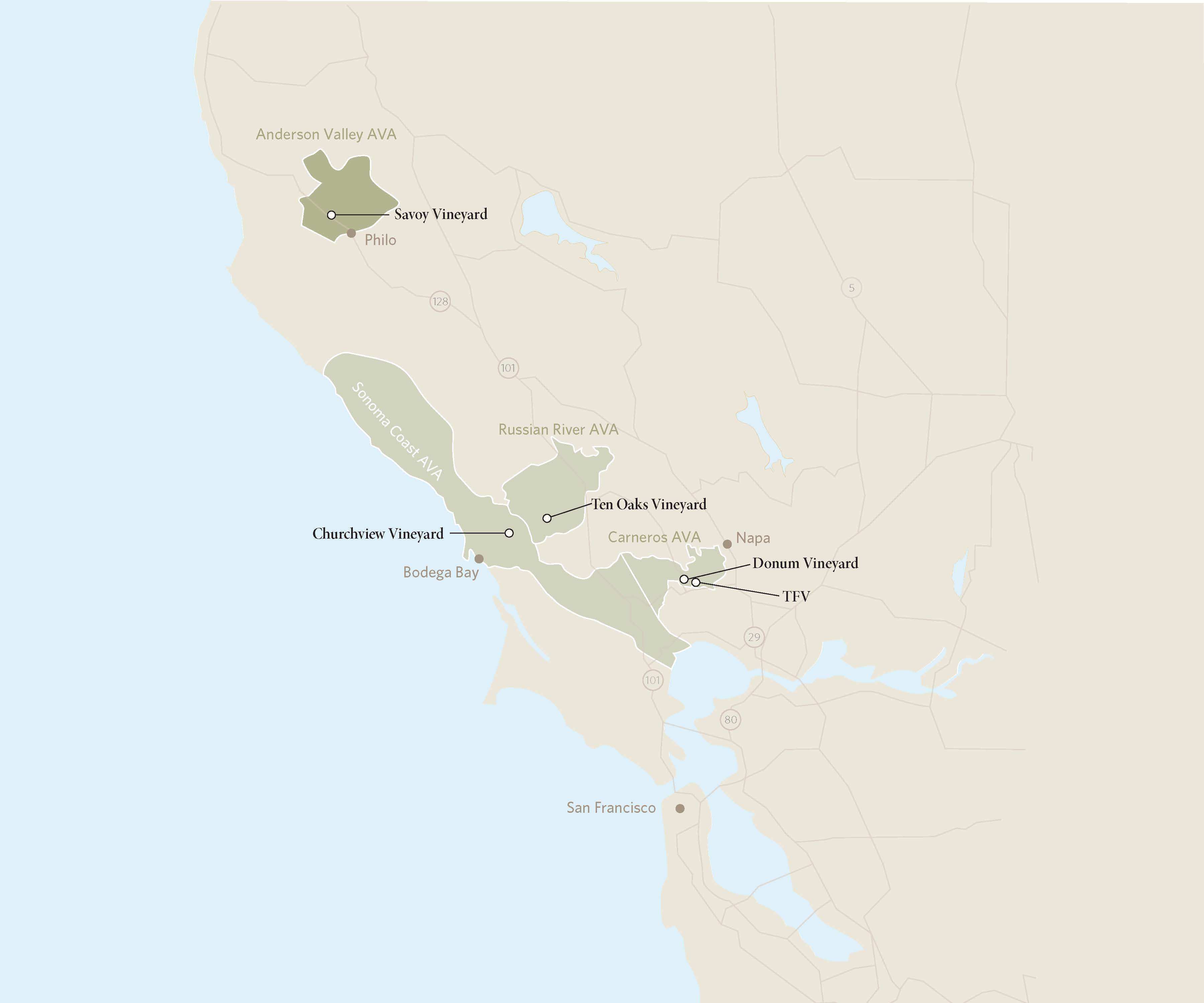 Originally planted in 1974 by Thomas Ferguson, this ranch officially became part of the Donum portfolio in 2016, though we had sourced fruit from this site for our Carneros Estate Pinot Noir during the 2000s. Following a complete vineyard redevelopment, we harvested our first fruit from this property in 2021. Just a mile away from our Estate, TFV stands out for its rocky terrain, scattered with large cobblestones, and its lighter-colored, silica-rich soils. These conditions make it one of the most unique sites in Carneros for both Pinot Noir and Chardonnay.